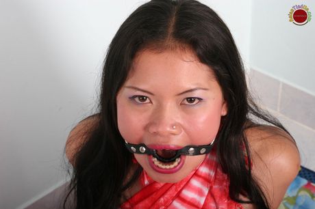 Asian Tied Up: Asian girl with tiny tits strips and unveils her pussy up close