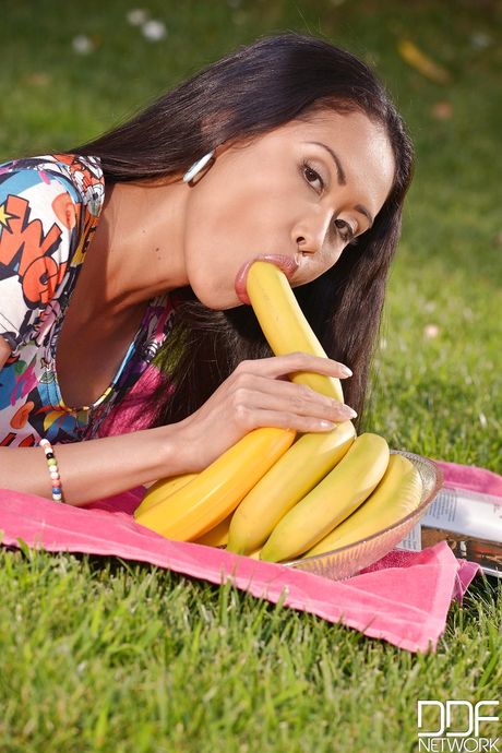 1 By Day: Peachy asian dark hair Danika in nice skirt exhibiting big tits and bald pussy outside