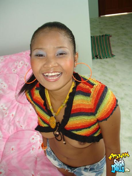 Asian Suck Dolls: Thai cutie with a very revealing top slides it up to show some perky tits